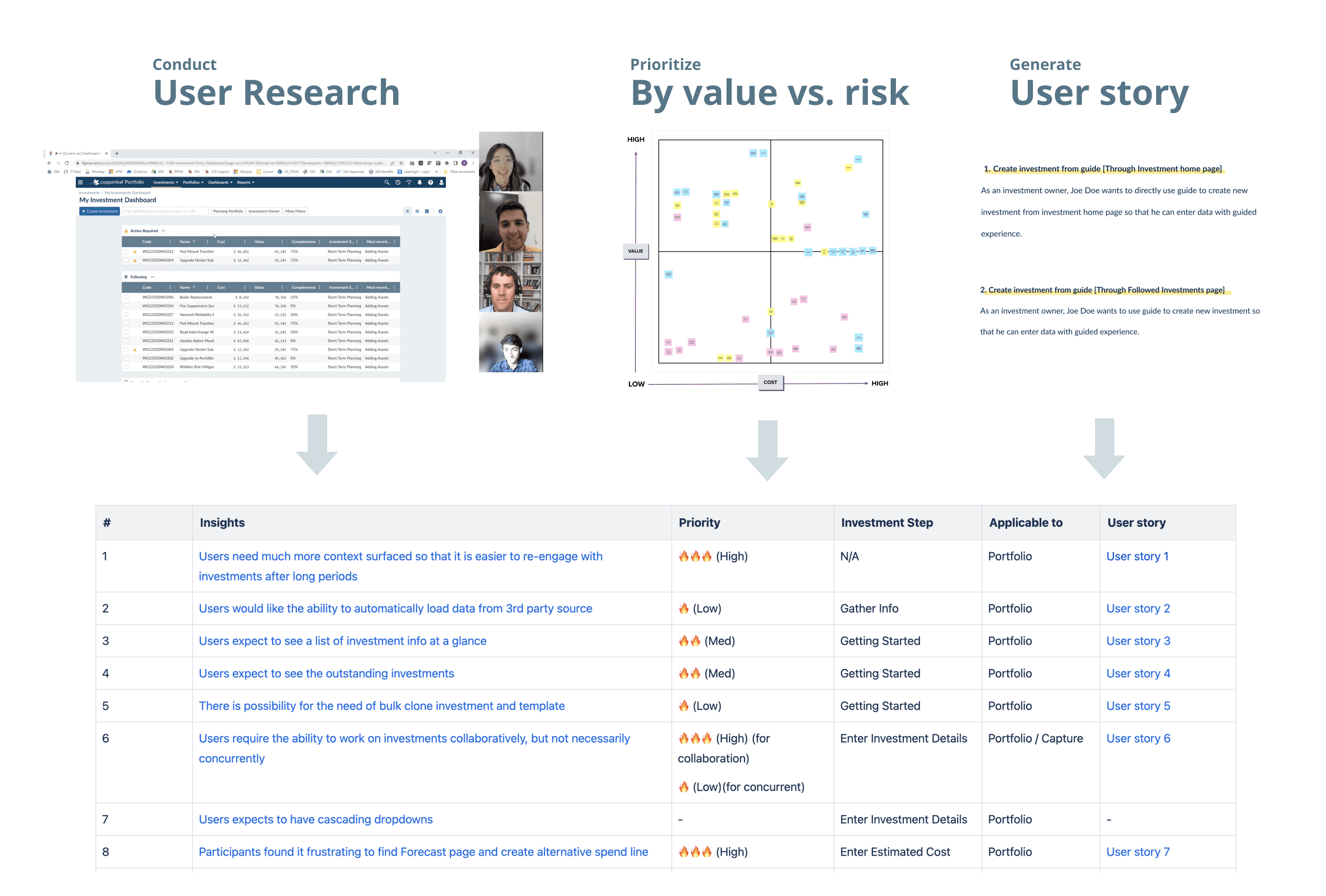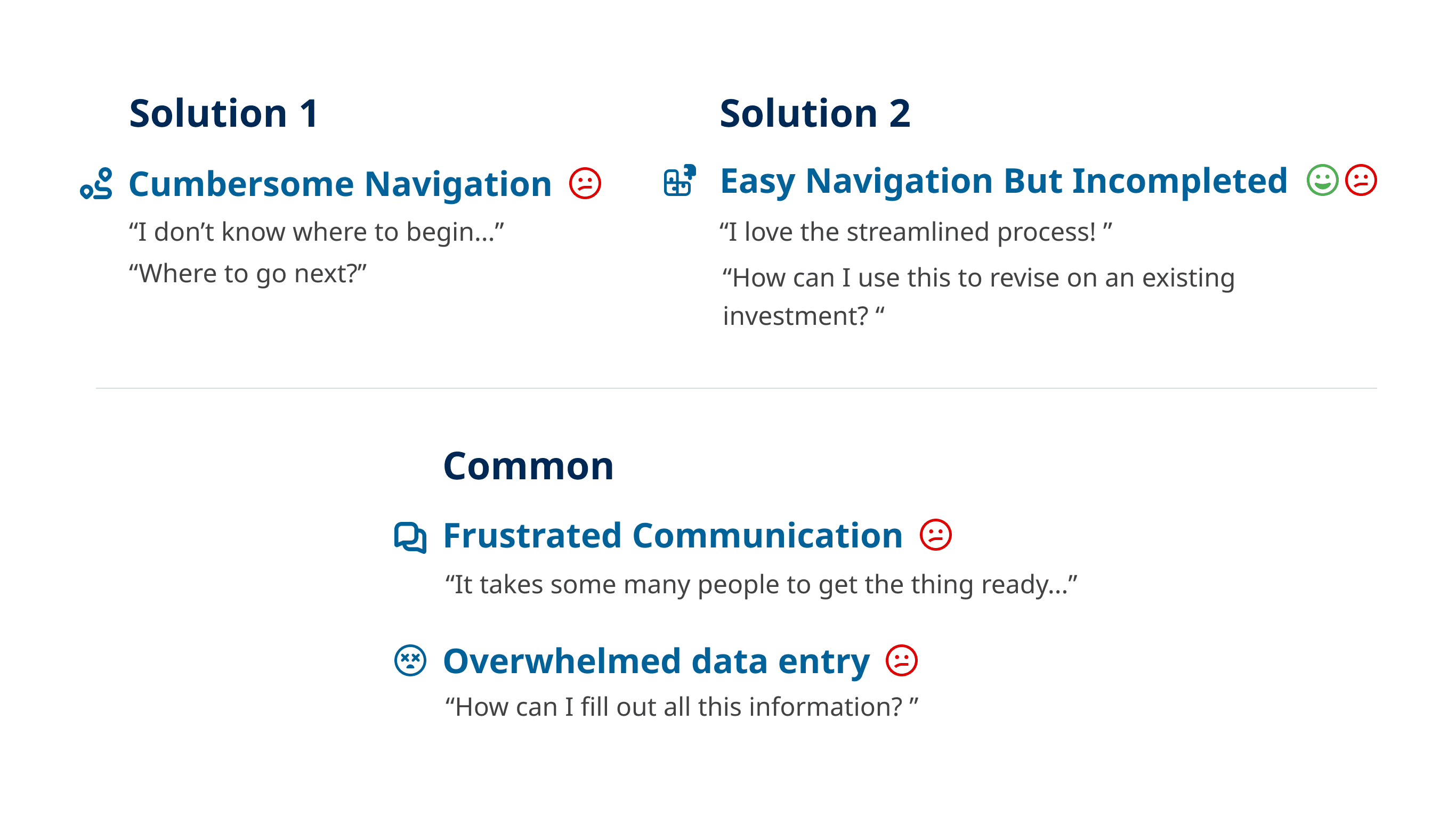 Since we were using proxies(internal team members who actively interact with clients) in the previous user journey mapping workshop sessions, there is the risk of capturing biased or incomplete data. I encourage the team to conduct additional usability testing sessions with clients using two existing investment entry solutions. The intention is to:
