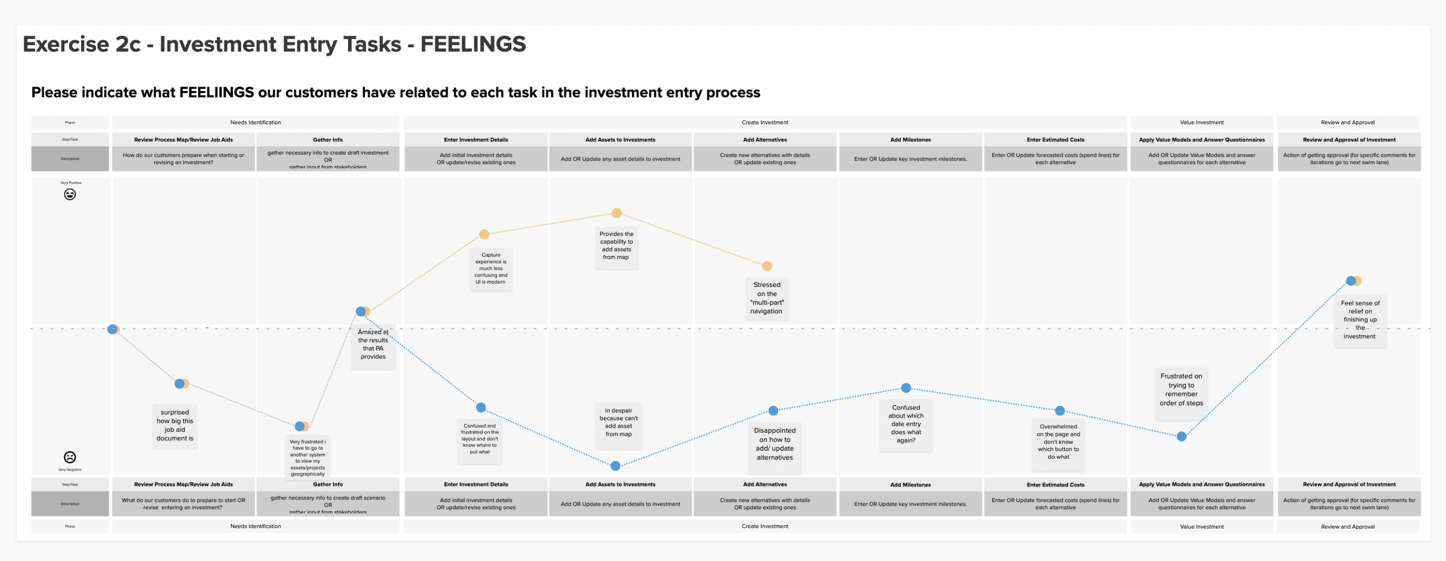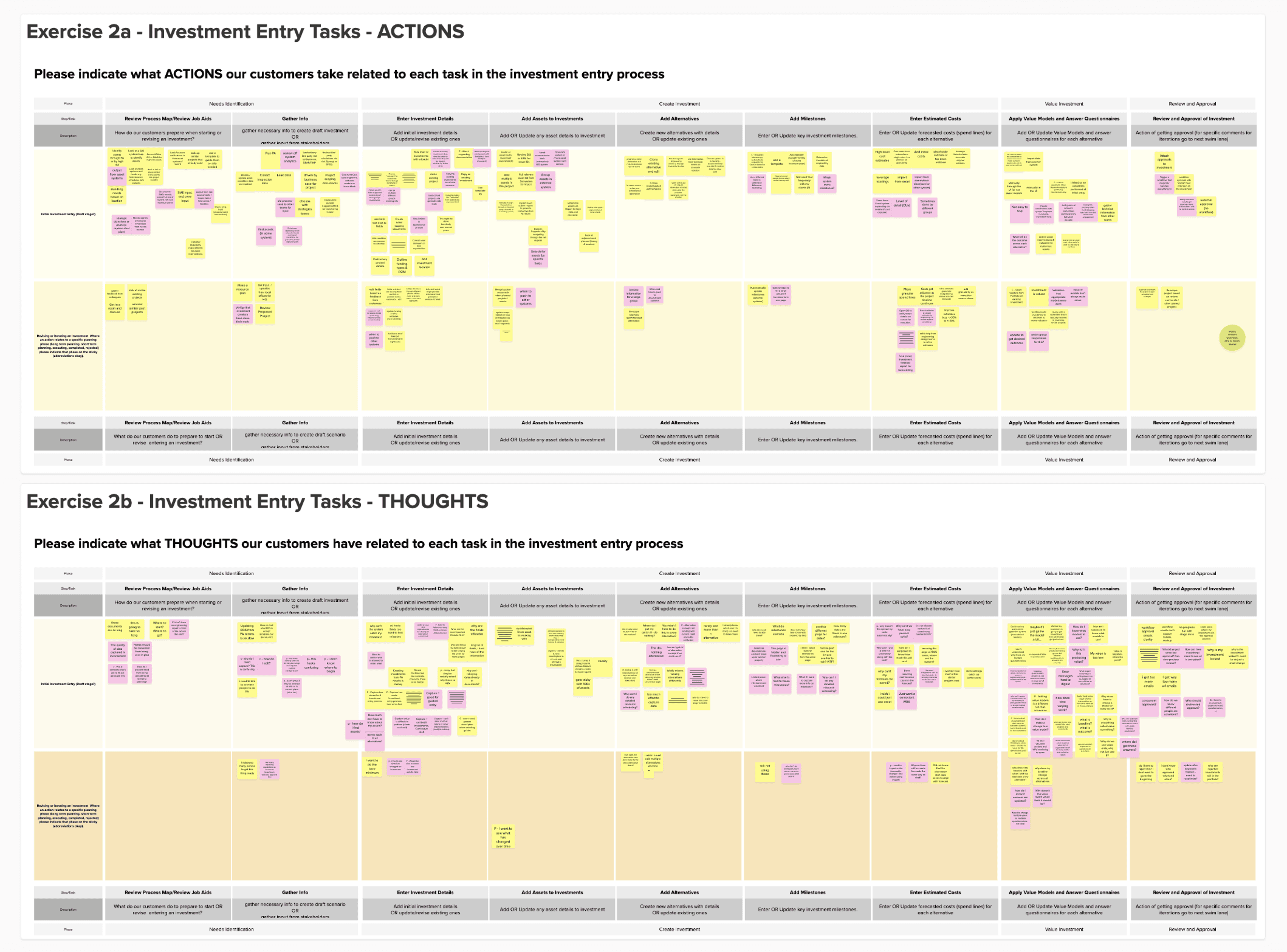 With the high-level problem in mind - The investment entry and editing experience is cumbersome and the clients are struggling while using the solution, the discovery team decided to run journey mapping workshops with the Customer Support team, Tech Sales team, Demo team and Support team members to identify clients’ action, thoughts, feelings and ideas for improvement for entering and editing investment.
